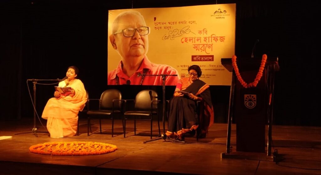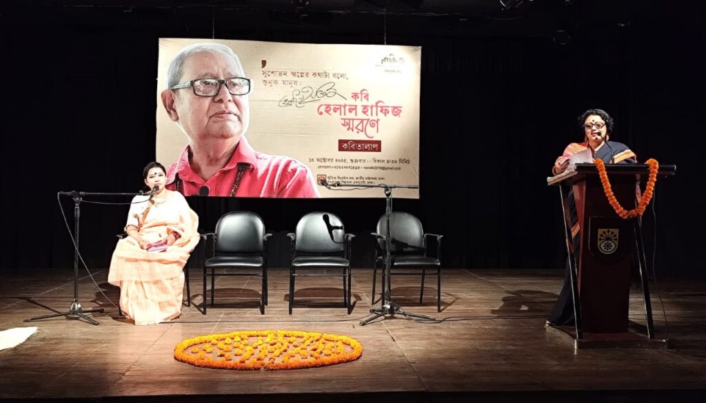 আজ ১০ই অক্টোবর ২০২৫, বাংলাদেশ শিল্পকলা একাডেমির জাতীয় নাট্যশালার স্টুডিও থিয়েটার হলে অনুষ্ঠিত হয় “কবি হেলাল হাফিজ স্মরণানুষ্ঠান”। কবি হেলাল হাফিজের স্মরণে নান্দিকের সুন্দর এই আয়োজনে উপস্থিত হন বন্ধু সুহৃদ ও শুভাকাঙ্ক্ষী। ভালোবাসার কথা কবিতা ও গানের মাধ্যমে নান্দিকের এই আয়োজনের শিরোনাম “কবিতালাপ”। কবিতা শুধু নয়, মানুষ হেলাল হাফিজকে ভালোবেসেছেন অসংখ্য মানুষ। তাঁর ভক্তের সংখ্যা আকাশ ছোঁয়া। সবাই মিলে কবি হেলাল হাফিজকে পাঠ করা হয়- তাঁর কথায়, কবিতায়। শুধু তাই নয়, কবির বিভিন্ন সময়ের সাক্ষাৎকার ও কথার স্মৃতিচারণও হয়।